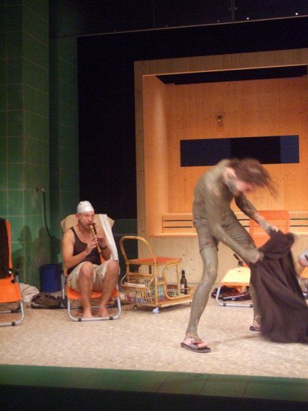 Director Krug celebrated a lot of fun with Messrs. Arpe, Burkia, Firit, Sachse, Teigel, Wolf and Verena Blankenburg as a female operatic encore. The men, originally in the south stand of a football stadium whispering, singing and bawling, were transported here to a sauna area (equipment: Steigert). (...) The wondrous musical purr with a sensitive theater bandmaster Thomas Voigt on the keyboard instrument captivated those who were willing to hear how accents can be shifted, how great normal actors in Rudolstadt can sing, like songs from a funny van Dannen or Sven Regener and "A Little Nymphomaniac" leads to the flat ground of male rituals. The Rudolstadt theatergoers were enthusiastic about these cover versions, which were not a copy of what had been heard a thousand times, and won encores.
